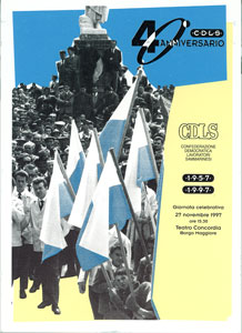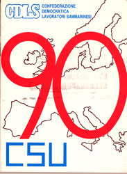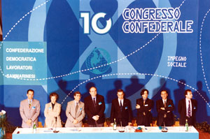 Maggio 95: X congresso della CDLS “Solidarietà, impegno sociale per una nuova cultura del lavoro”: Le tesi su cui si svolse il Congresso furono varie, ma la più innovativa risultò senz’altro quella legata al concetto di solidarietà, che d’altronde era centrale anche nel titolo dato al congresso stesso. Il paese aveva infatti raggiunto una “positiva situazione economico-occupazionale”, e gli obiettivi di politica sociale conquistati dai lavoratori sammarinesi permettevano al sindacato di “impegnarsi maggiormente per il recupero delle radici di solidarietà, impegno sociale per una nuova cultura del lavoro”, patrimonio della CDLS e tema del congresso, “valori che in un contesto di benessere come quello raggiunto, rischiano di essere dimenticati. Per quanto concerneva l’occupazione, le tesi congressuali sottolineavano che la situazione era buona perché, a parte una leggera disoccupazione definita fisiologica, i dati erano positivi. Infatti dai 9.600 lavoratori dipendenti del 1990, si era passati agli 11.600 del ’93 ai 12.200 del ’94. Grazie al benessere che poteva offrire, la Repubblica stava trasformandosi in un paese di immigrati, ribaltando quella che era la sua tradizione storica. Il congresso terminò con la divulgazione di una mozione conclusiva in cui si plaudiva all’istituzione della Fondazione “Solidarietà” “finalizzata alla realizzazione di aiuti a favore delle popolazioni del terzo mondo”, e si invitavano i lavoratori e i cittadini a sostenere le iniziative da lei adottate prendendo atto che si era già manifestata tra gli iscritti “la decisa volontà di sviluppare i valori e la cultura della solidarietà, dell’impegno sociale, di una nuova cultura del lavoro, della difesa dell’ambiente, del potenziamento dello stato sociale e dei servizi; evidenziando nel contempo la preoccupazione che le attuali condizioni positive dell’economia e dell’occupazione possano in prospettiva non essere confermate senza l’attivazione di precisi progetti e programmi”. Inoltre invitava i nuovi organi dirigenti ad adoperarsi per: