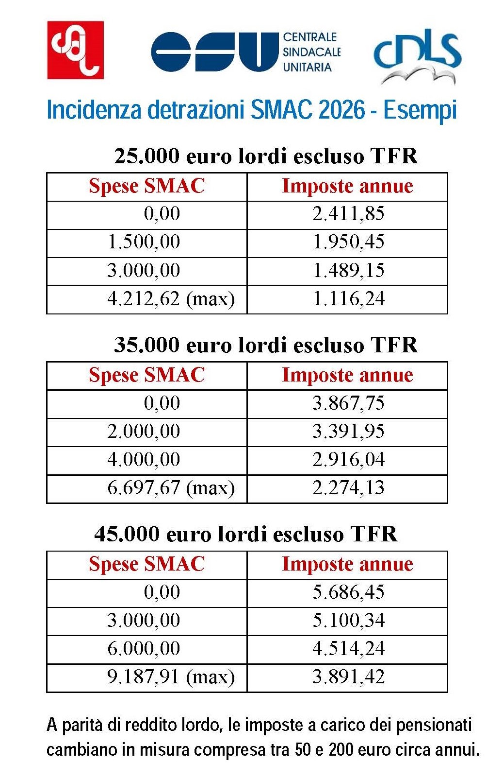 Alleghiamo una tabella con tre esempi di reddito da lavoro dipendente per visualizzare la diversa incidenza delle detrazioni SMAC per l’anno 2026.